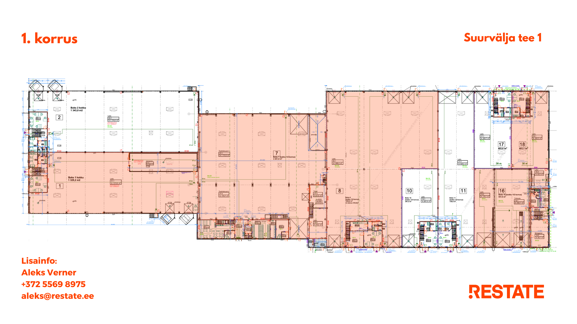 | Äripind 2265 m² | Büroo 199,1 m² | Ladu 1869,8 m² | Esindus 196,1 m² | Välja üüritud |